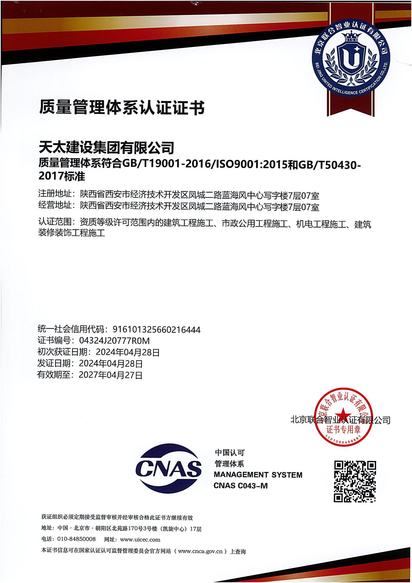質(zhì)量管理體系認(rèn)證證書