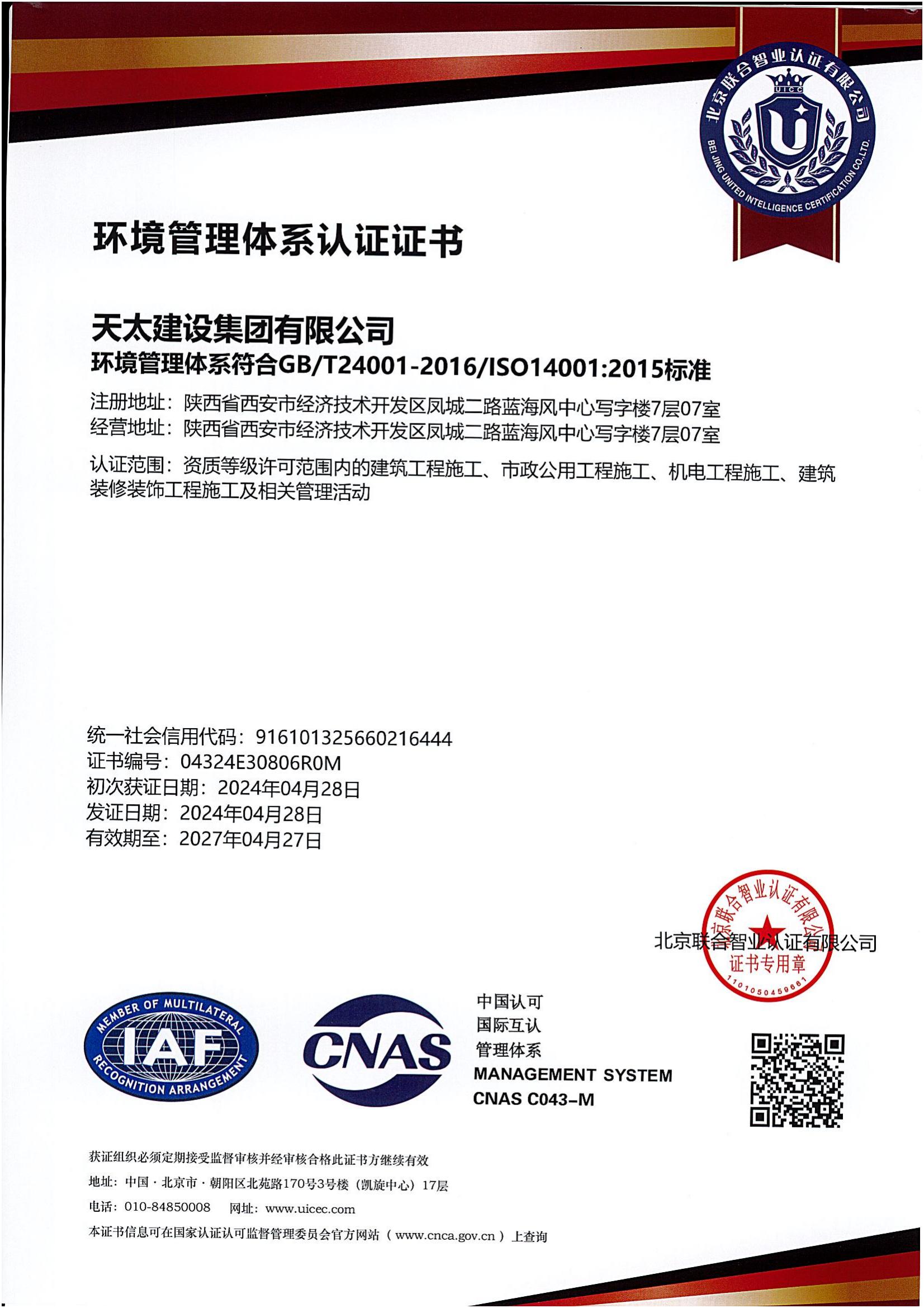 環(huán)境管理體系認(rèn)證證書